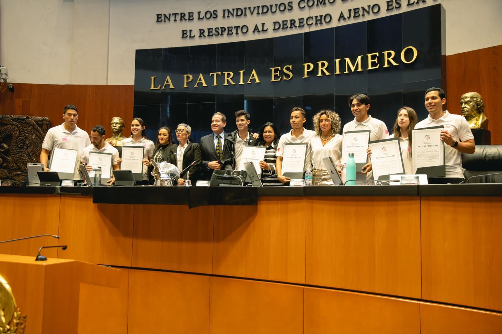 El presidente de la Mesa Directiva, Alejandro Armenta Mier, recibió a los deportistas en el Salón Ifigenia Martínez del Senado. Ahí subrayó su trayectoria y participación en la competencia internacional.