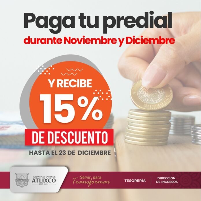 Atlixco, Puebla.- A fin de apoyar la economía de las familias atlixquenses, en sesión de cabildo, regidores del Ayuntamiento de Atlixco, presidido por Ariadna Ayala, aprobaron el 15% de descuento en el pago predial anticipado 2023, durante los meses de noviembre y diciembre del presente año para contribuyentes cumplidos.
