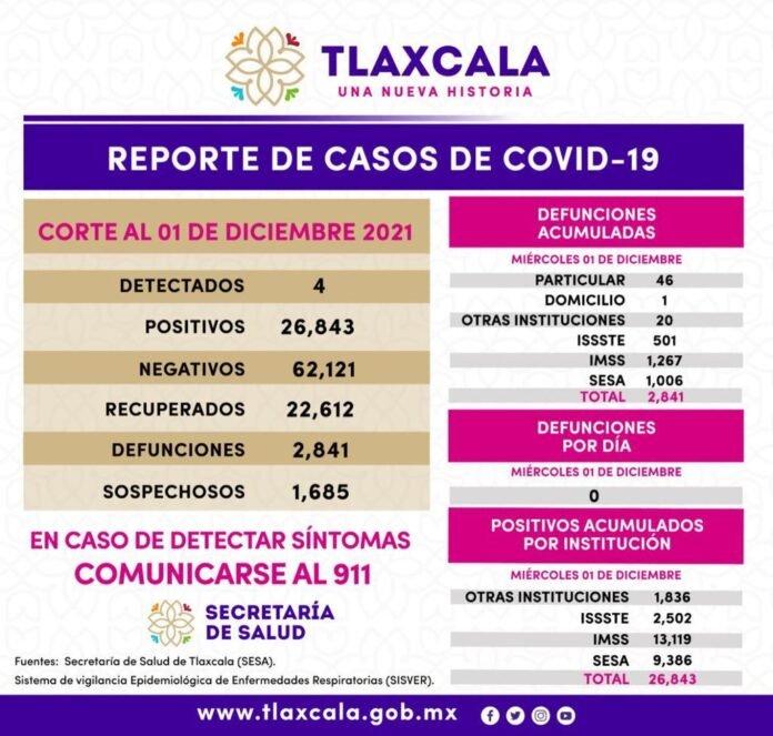 Los datos de la SESA registrados en la plataforma nacional del Sistema de Vigilancia Epidemiológica de Enfermedades Respiratorias (Sisver), confirmaron 4 casos positivos de Covid-19 y cero defunciones el 01 de diciembre de 2021.