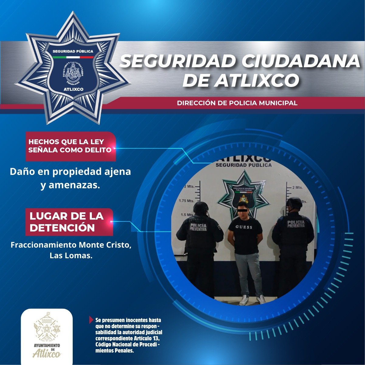 Secretaría de Seguridad Ciudadana de Atlixco detiene a hombre por daños, amenazas y agresión en Monte Cristo