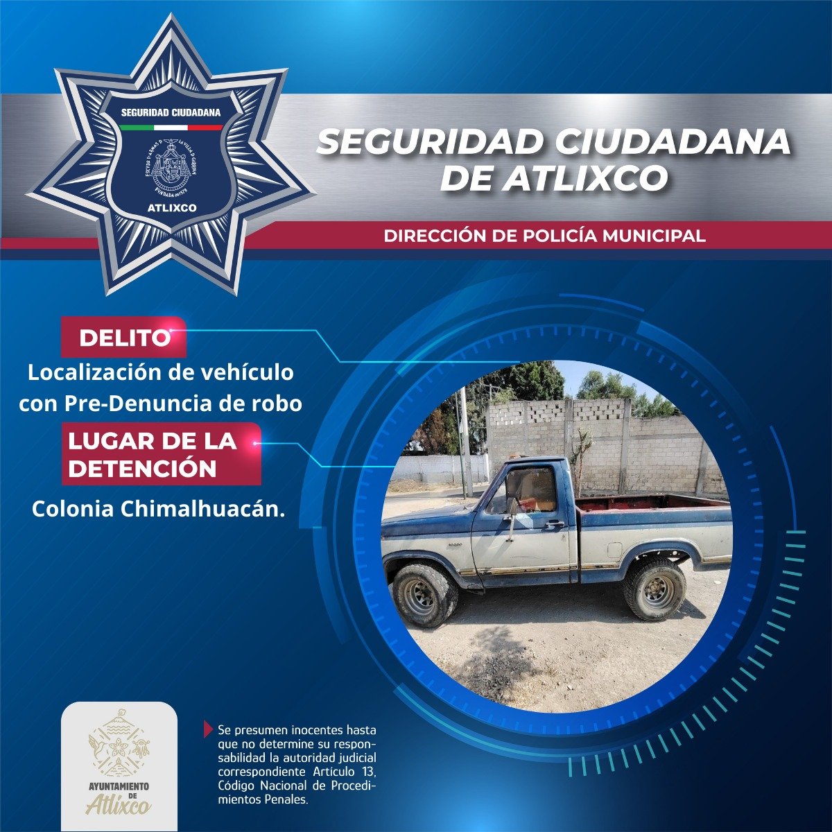 Atlixco, Puebla.- Durante recorridos de vigilancia en la colonia Chimalhuacán, la Secretaría de Seguridad Ciudadana de Atlixco, en coordinación con la Policía Estatal Preventiva, localizó una camioneta Ford F-150, modelo 1980, abandonada en el Camino a San José Recreo.