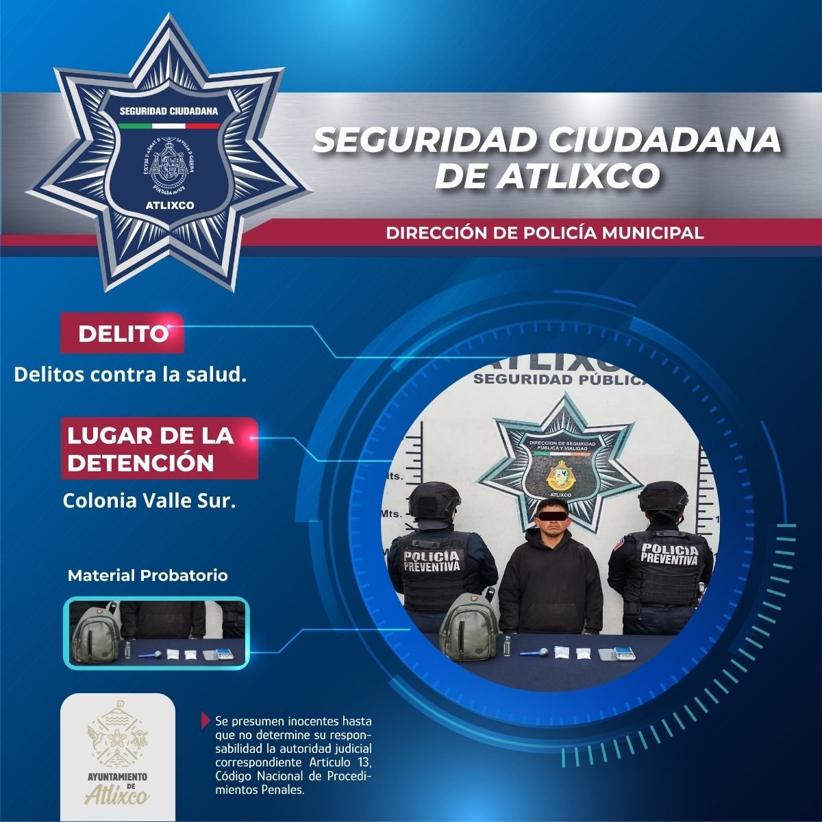 Atlixco, Puebla.- Como parte de los recorridos permanentes de vigilancia, la Secretaría de Seguridad Ciudadana de Atlixco aseguró a un hombre en la colonia Valle Sur, tras ser detectado consumiendo presuntas sustancias ilícitas en la vía pública.