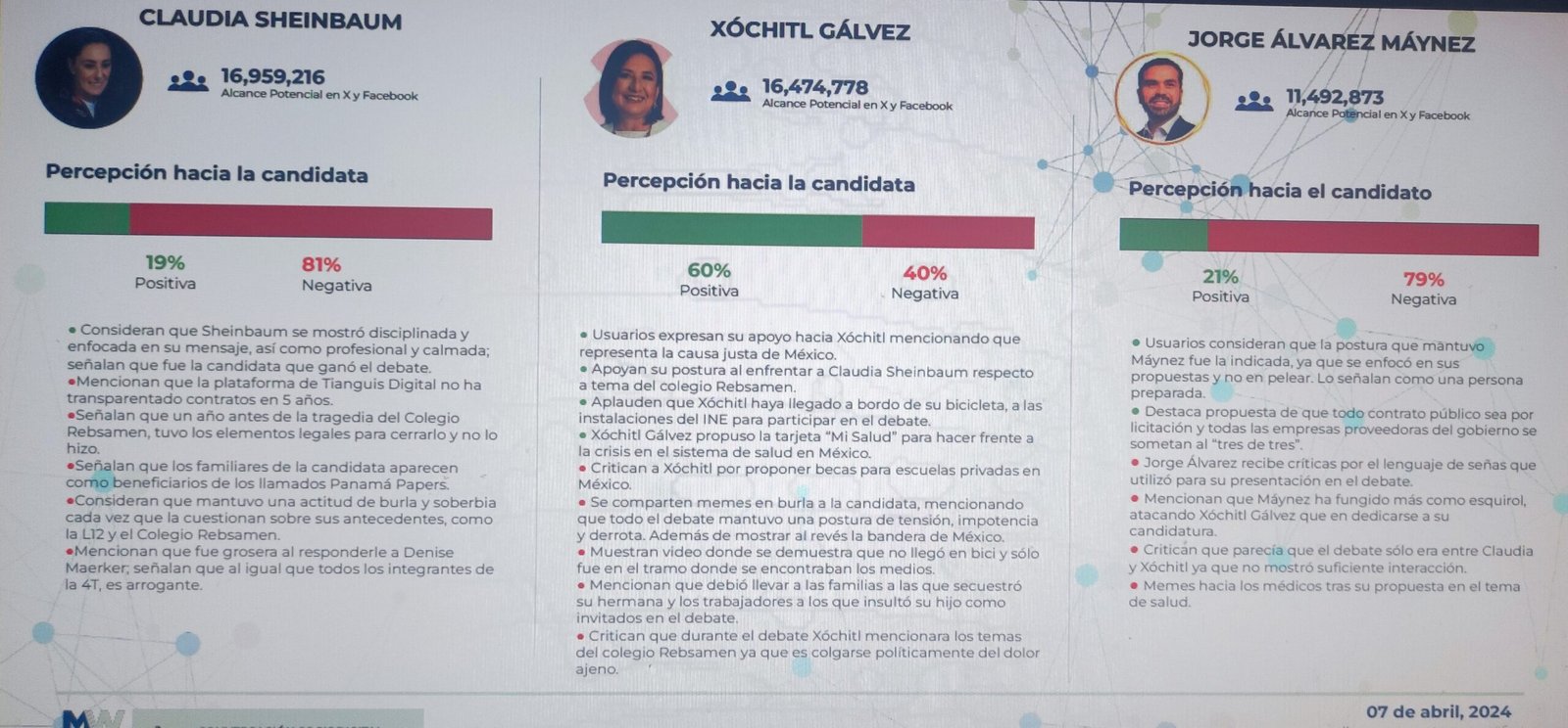 El análisis de la conversación socio digital del 7 de abril de 2024 de MW Group, en base al análisis de Facebook y X (Antes Twitter), analizados por https://www.perceptionkeys.com demostró que Xóchitl Gálvez tuvo más menciones positivas que Claudia Sheinbaum y José Álvarez Máynez en el debate del domingo pasado.