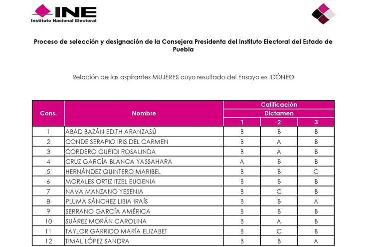 Puebla, Puebla (Mex).- El Colegio de México (COLMEX) entregó al Instituto Nacional Electoral (INE) los resultados del ensayo correspondiente al proceso de selección y designación al cargo de Consejera Presidente del Organismo Público Local Electoral (OPLE) en el estado de Puebla, mediante el cual 12 aspirantes acreditaron los dictámenes y obtuvieron la calificación de idóneo.
