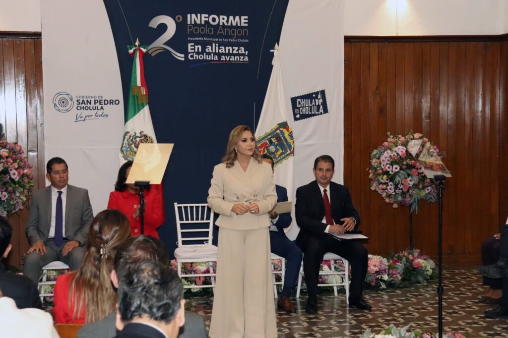 En su mensaje político del Segundo Informe, Paola Angon, declaró “vamos en la dirección correcta, por lo tanto, la disyuntiva es, si continuamos por el camino del bienestar o regresamos al pasado”. Y afirmó que es una persona incómoda para los grupos de intereses políticos que quieren ver a Cholula sumida en el pasado, lleno de rezagos sociales.