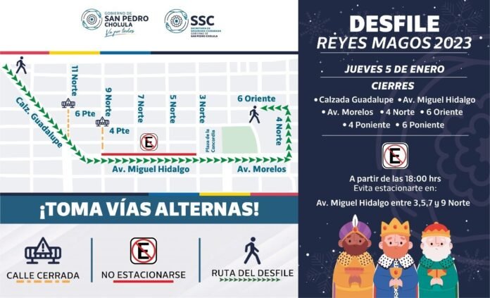 San Pedro Cholula, Puebla.- Con el objetivo de brindar seguridad a los participantes del Desfile de Reyes Magos -organizado por el Sistema Municipal DIF de San Pedro Cholula-, a realizarse este jueves 5 de enero, elementos de Vialidad Municipal de la Secretaría de Seguridad Ciudadana, implementarán cierre de las siguientes vialidades en un horario de 18:00 a 21:00 Hrs.