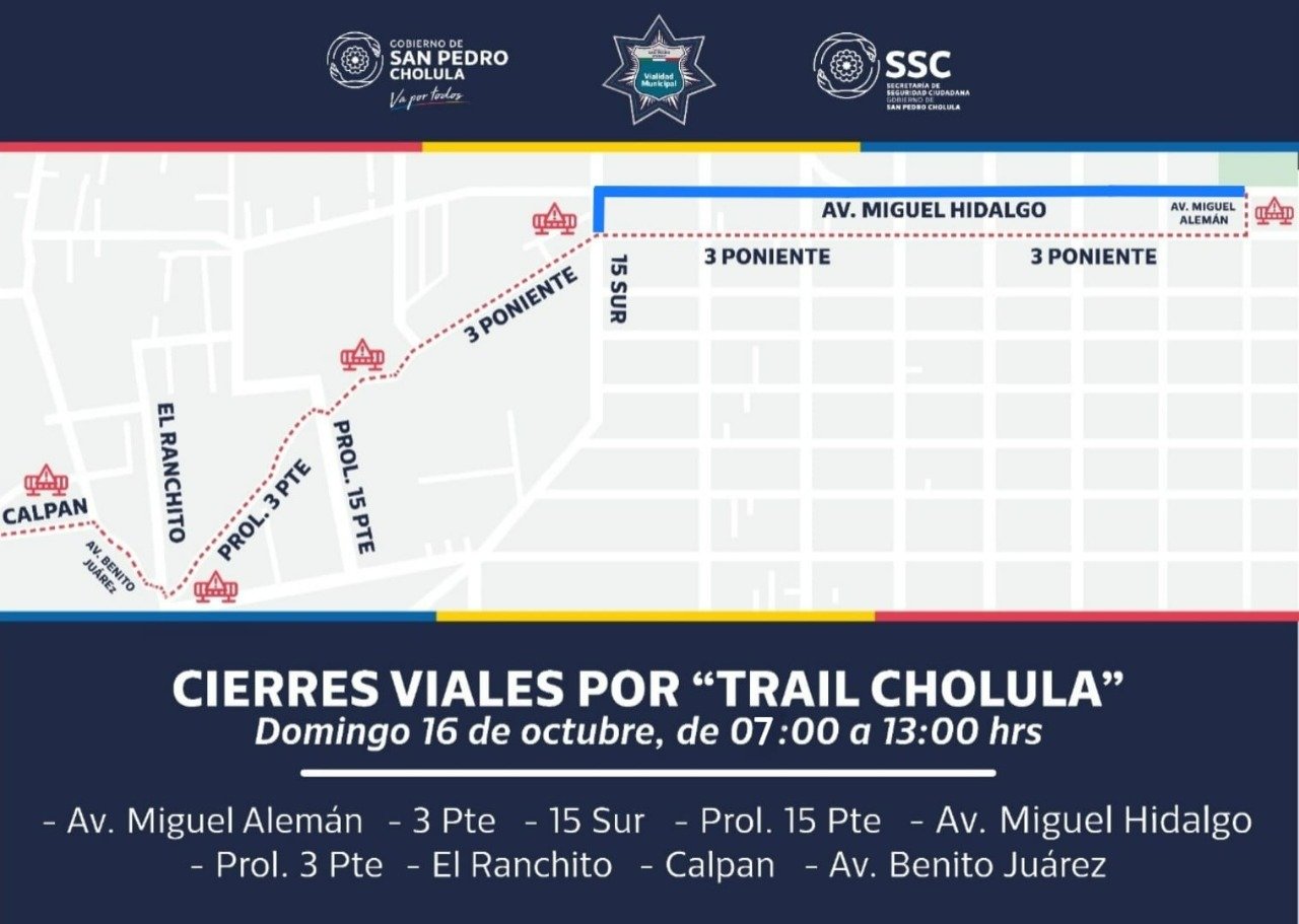 San Pedro Cholula, Pue.- Con el objetivo de garantizar la seguridad de los participantes en la carrera deportiva “Trail Cholula”, este domingo 16 de octubre, elementos de Vialidad Municipal de la Secretaría de Seguridad Ciudadana de San Pedro Cholula, implementarán cierre de las siguientes vialidades, en un horario de 7:00 a 13:00 hrs.
