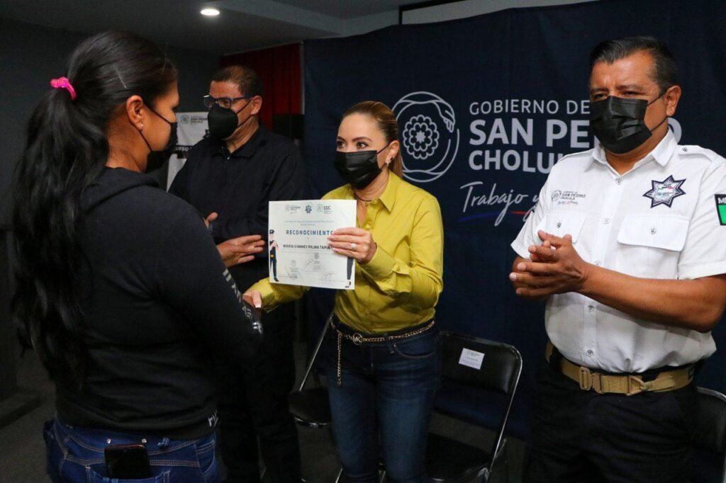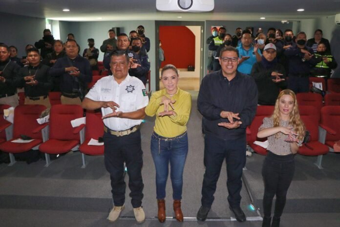 San Pedro Cholula, Pue.- Con el objetivo de implementar políticas públicas que impulsen los derechos humanos y la inclusión de todos los grupos y sectores, la presidenta Paola Angon, en compañía del Secretario de Seguridad Ciudadana, Sergio Fernández Martínez y el Subsecretario, Fernando de Jesús Ortiz Ortega, encabezaron la entrega de 40 reconocimientos a participantes del primer taller de capacitación en Lenguaje de Señas Mexicana a elementos de la corporación.