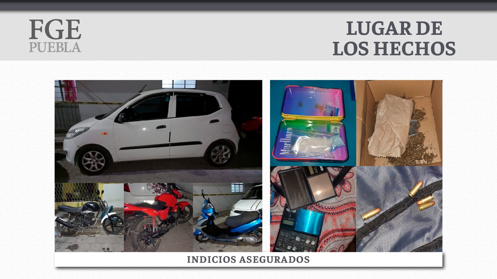 También en seguimiento, la Fiscalía General del Estado de Puebla solicitó, obtuvo y cumplió órdenes de cateo. En siete inmuebles del municipio de Atlixco donde aseguró: diversas cantidades de cristal y marihuana, dos armas de fuego, 11 motocicletas y básculas grameras.